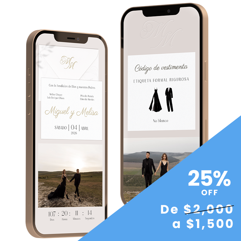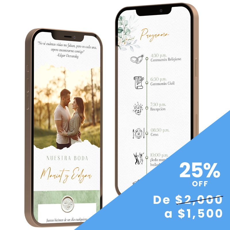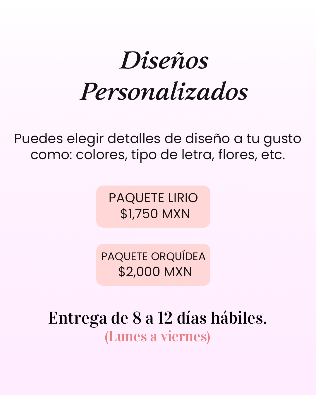 CatálogoEstás Invitado2026-02-02T23:33:11-06:00 CATÁLOGO Los diseños incluyen las secciones del paquete Orquídea.VerLas frases se pueden cambiar a su gusto, así como la parte de mesa de regalo, itinerario o vestimenta. En el caso de cambiar detalles de diseño como:ColoresFloresTipo de letraConsulta el costo u opta por un diseño personalizado:Ver DISEÑOS 01 Ver 02 Ver 03 Ver 04 Ver 05 Ver 06 Ver 07 Ver 08 Ver 09 Ver 10 Ver 11 Ver 12 Ver 13 Ver 14 Ver 15 Ver 16 Ver ¿Quieres limitar la cantidad de boletos a tus invitados? Utiliza pases digitales Puedes incluir alguna de estas opciones Ver