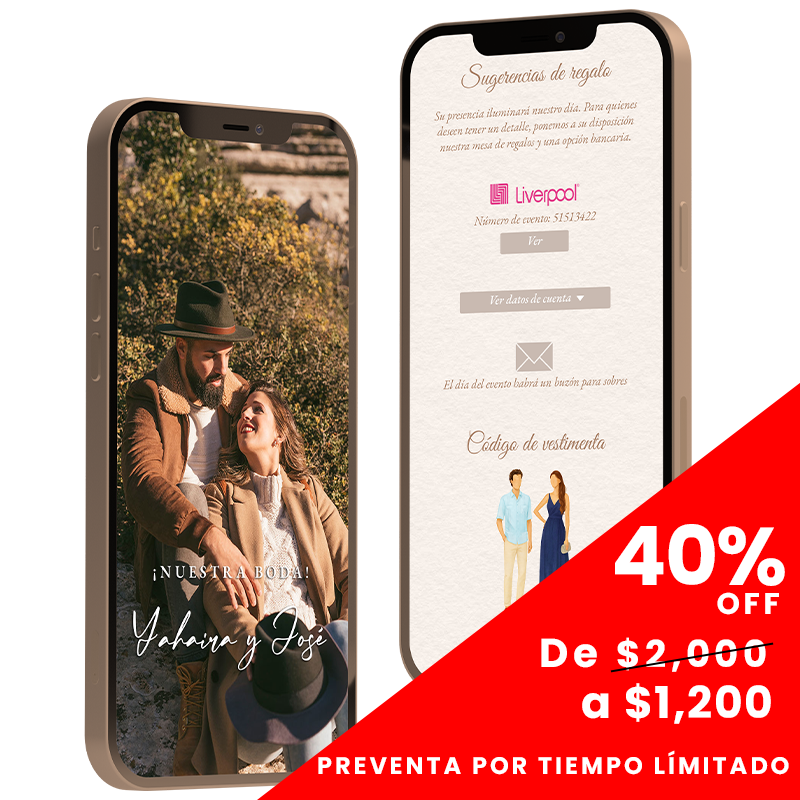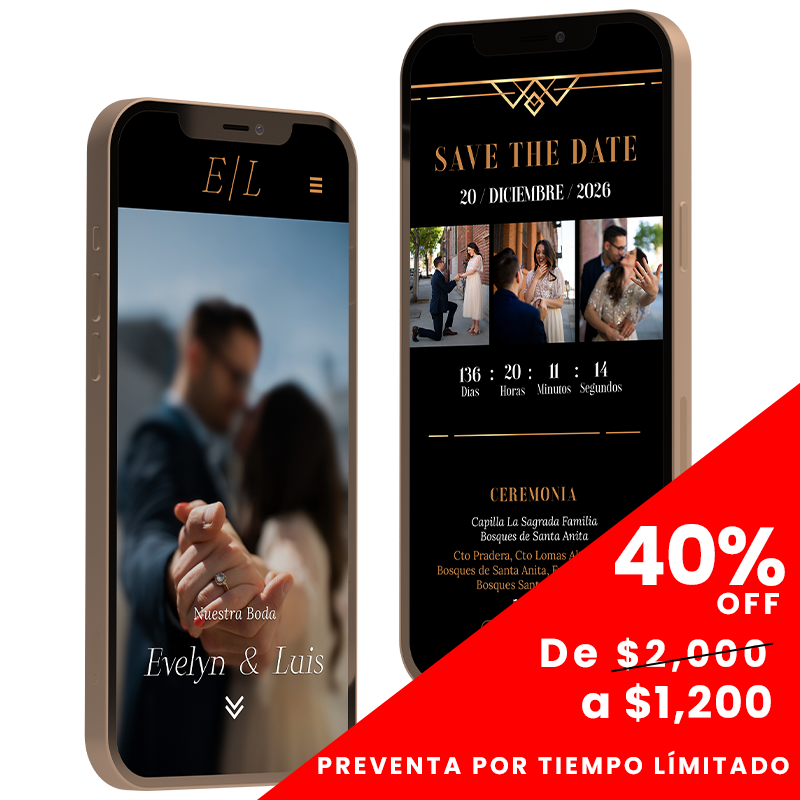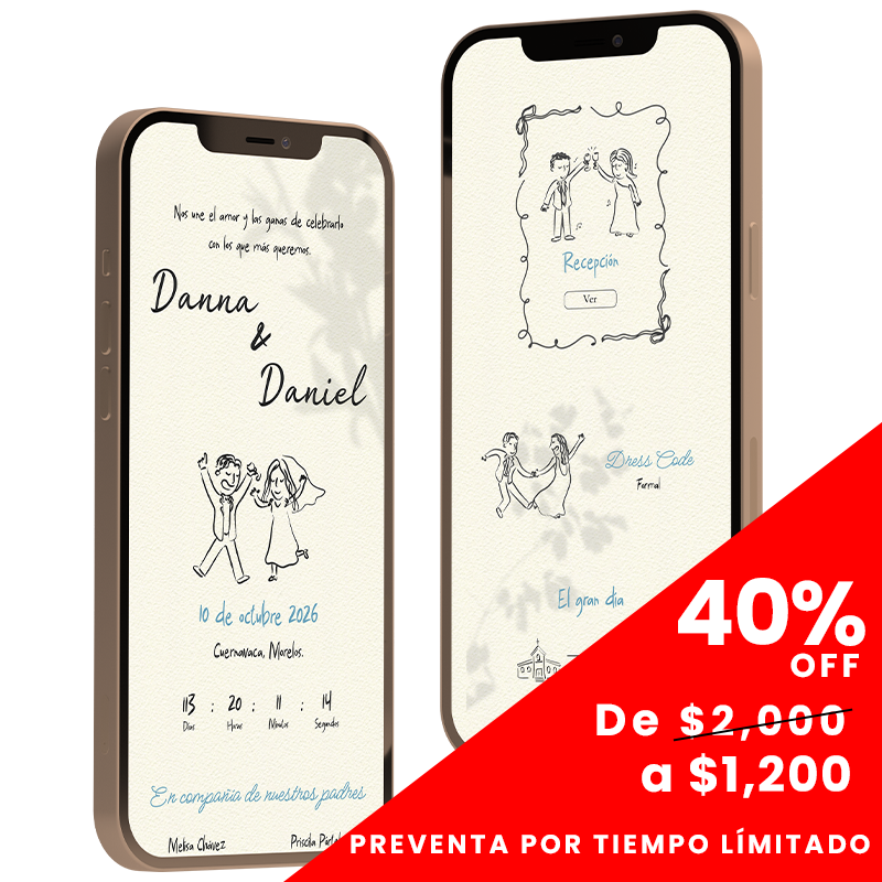 CatálogoEstás Invitado2026-03-05T16:11:13-06:00 CATÁLOGO Los diseños incluyen las secciones del paquete Orquídea.VerLas frases se pueden cambiar a su gusto, así como la parte de mesa de regalo, itinerario o vestimenta. En el caso de cambiar detalles de diseño como:ColoresFloresTipo de letraConsulta el costo u opta por un diseño personalizado:Ver DISEÑOS 01 Ver 02 Ver 03 Ver 04 Ver 05 Ver 06 Ver 07 Ver 08 Ver 09 Ver 10 Ver 11 Ver 12 Ver 13 Ver 14 Ver 15 Ver 16 Ver 17 Ver ¿Quieres limitar la cantidad de boletos a tus invitados? Utiliza pases digitales Puedes incluir alguna de estas opciones Ver